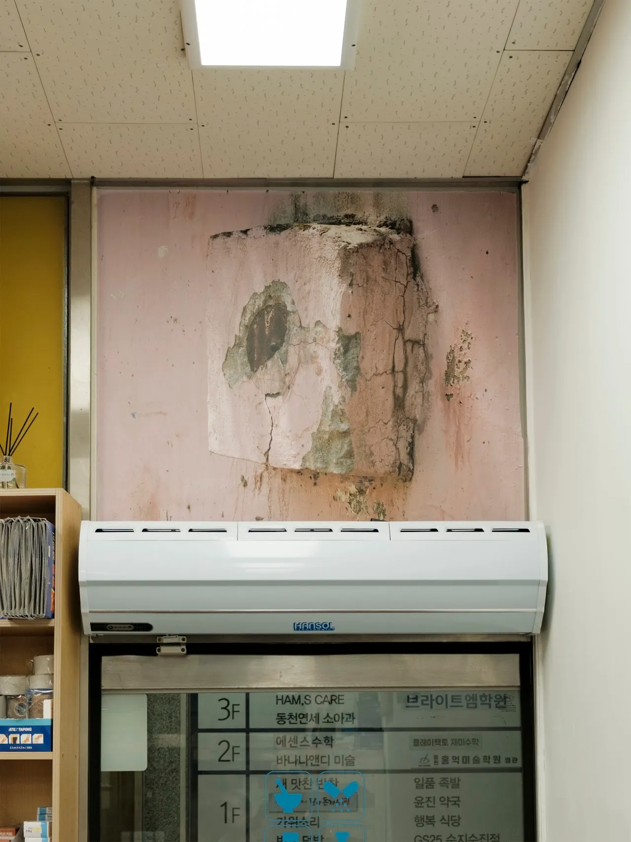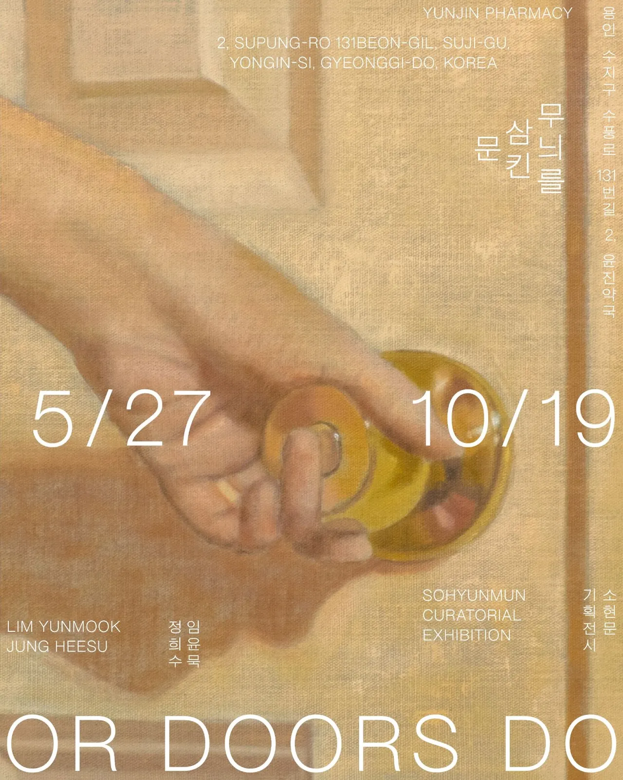 창창한 기운이 만연한 여름날(小滿)부터 겨울이 돌아오는 날(立冬)까지 소현문과 윤진약국은 《무늬를 삼킨 문》을 엽니다. 윤진약국 재개원 1주년을 기념하는 이번 전시는 약국과 마을이 서로를 살피는 새로운 이음입니다. 약사가 의약품을 조제하거나 처방하고 이용자가 문의하거나 대기하는 일상의 반경에서 시인과 작가는 (약국 벽면과 선반을 일시적/임의적 지지체 삼는 예외적 조건과 큐레이션으로)뜻밖의 발견을 제안합니다.(중략)